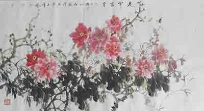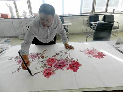 10月7日,当代著名画家王玉伟到访MK.COM,受到公司领导热情接待。图为王玉伟即兴创作《花开富贵》。(办公室 冯继宏)